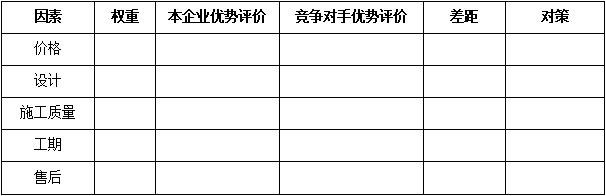 F、關(guān)鍵成交因素對比:對于某一個細(xì)分領(lǐng)域的客戶而言,成交的關(guān)鍵因素選項是相對清晰的,而這些因素對成交的影響權(quán)重是不同的,經(jīng)營分析就需要識別競爭對手在哪些關(guān)鍵成交因素上占據(jù)優(yōu)勢。例如:對于裝飾裝修工程行業(yè)的家庭客戶而言,其成交因素包括:價格、設(shè)計、施工質(zhì)量、工期、售后的維修維保服務(wù)等。對于一個收入中等的自住新房客戶而言,價格、設(shè)計因素、施工質(zhì)量是其主要成交因素,而對于商鋪、投資房產(chǎn)來說,工期的重要性不言而喻。如下表: